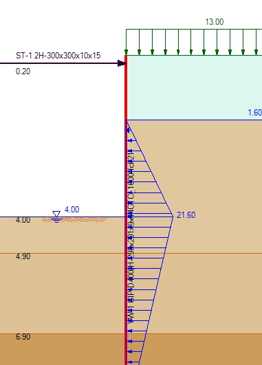 5) surcharge 는 지표면에 작용을 하며 지표면은 가상의 공기층 위에 있습니다. 따라서 surcharge 하중도 공중에 떠 있게 됩니다. 공기층에 있는 흙막이 벽도 surcharge 하중에 의한 횡압력을 받습니다.(실제로는 그 부분은 하중을 안 받기 때문에 왜곡이 생길 수 있습니다.)