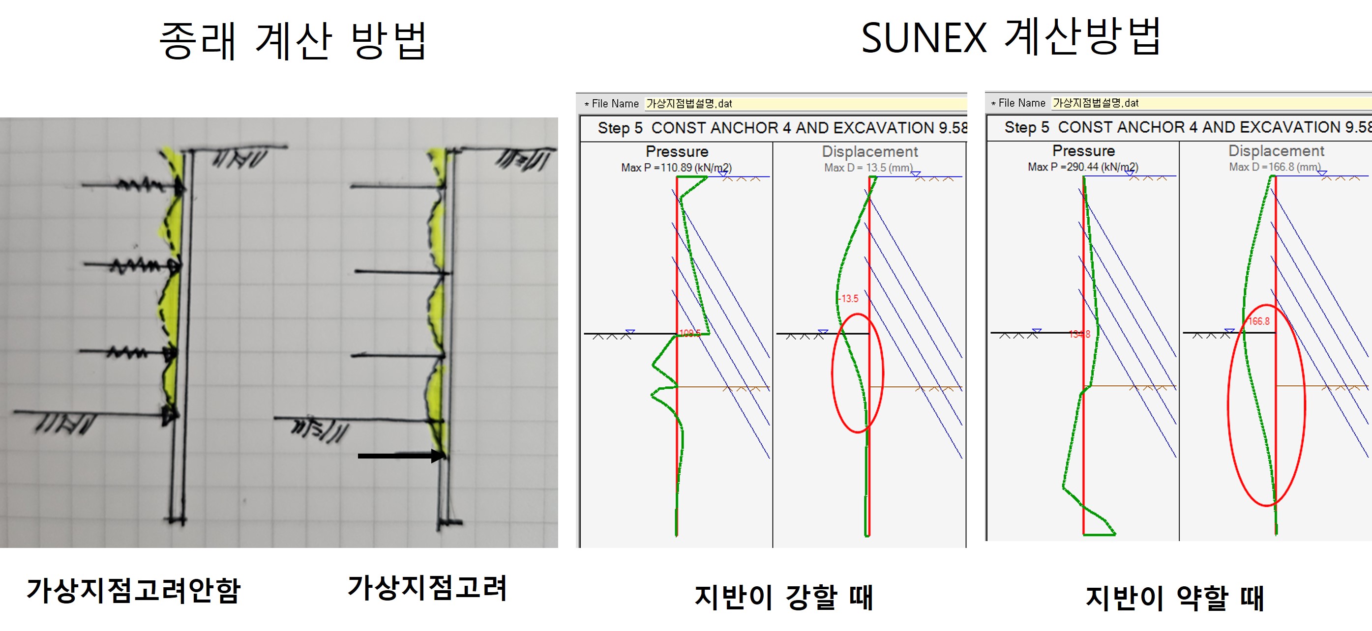 실제 변위는 굴착바닥 아래에서도 일어나기 때문입니다. 그 현상을 고려하기 위하여 가상지점법이 사용되었습니다. 굴착면이하 일정 깊이까지 변위가 생긴다고 보고 가상지점을 굴착바닥보다 깊은 곳에 위치한다고 보는 계산방법입니다.